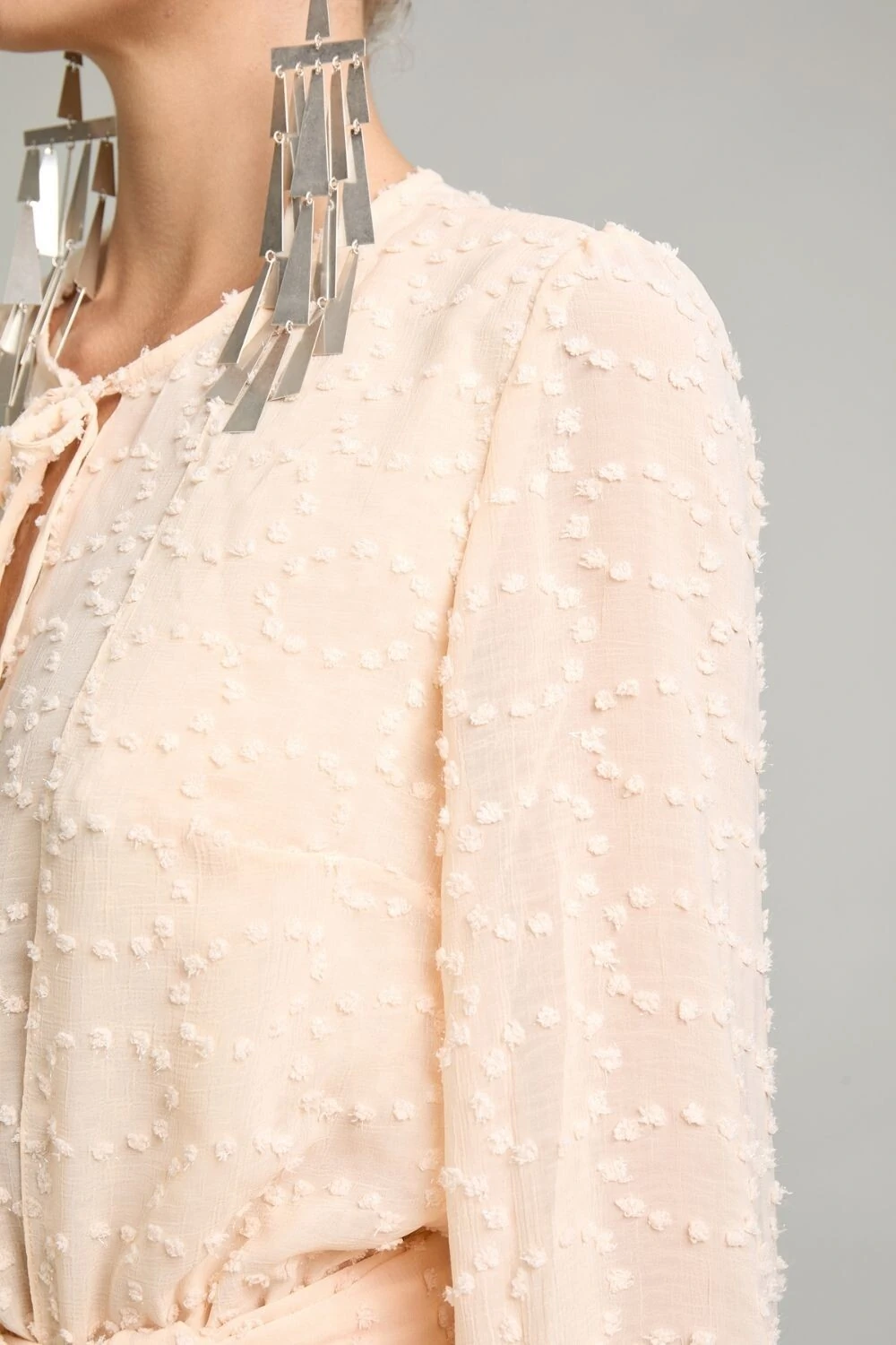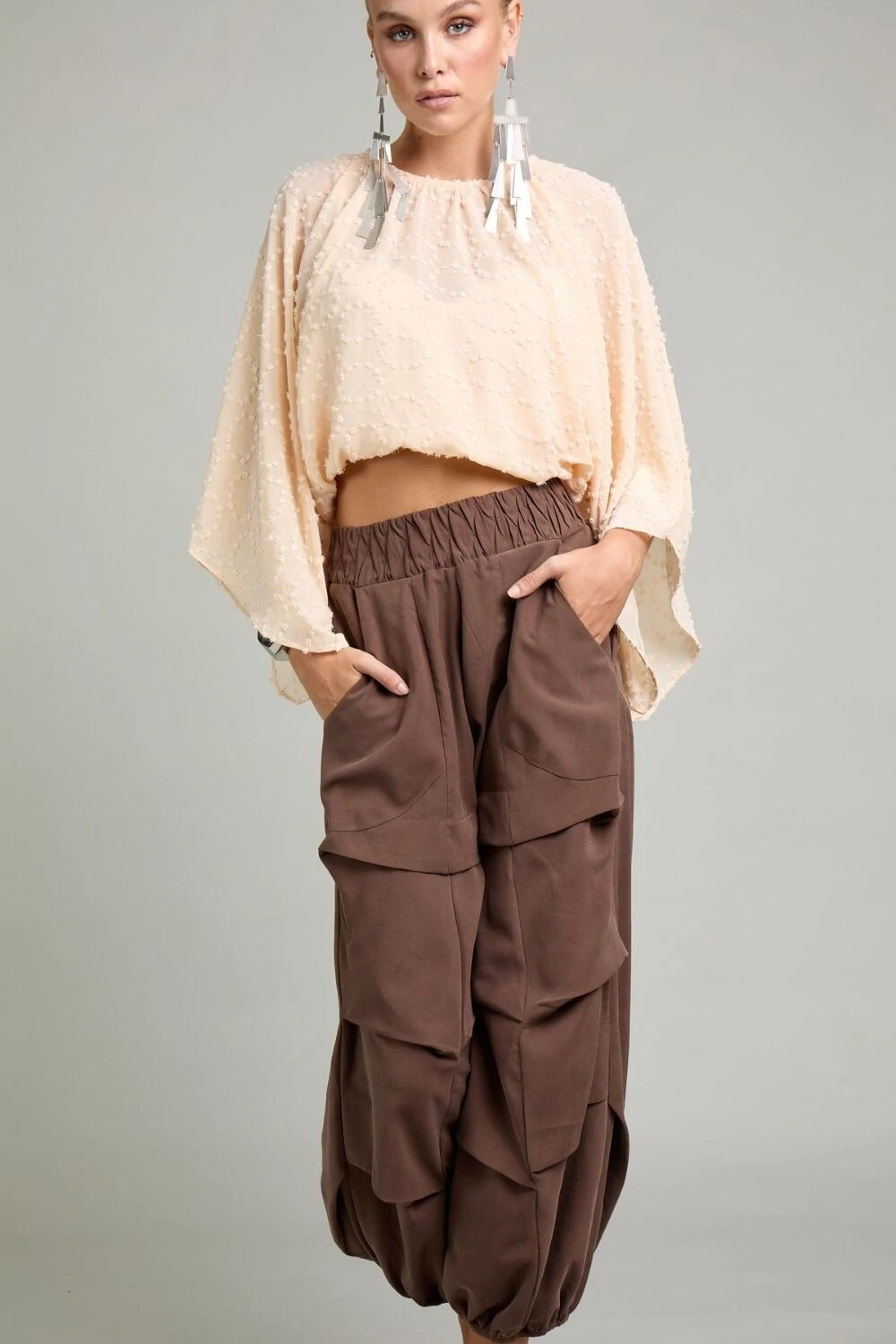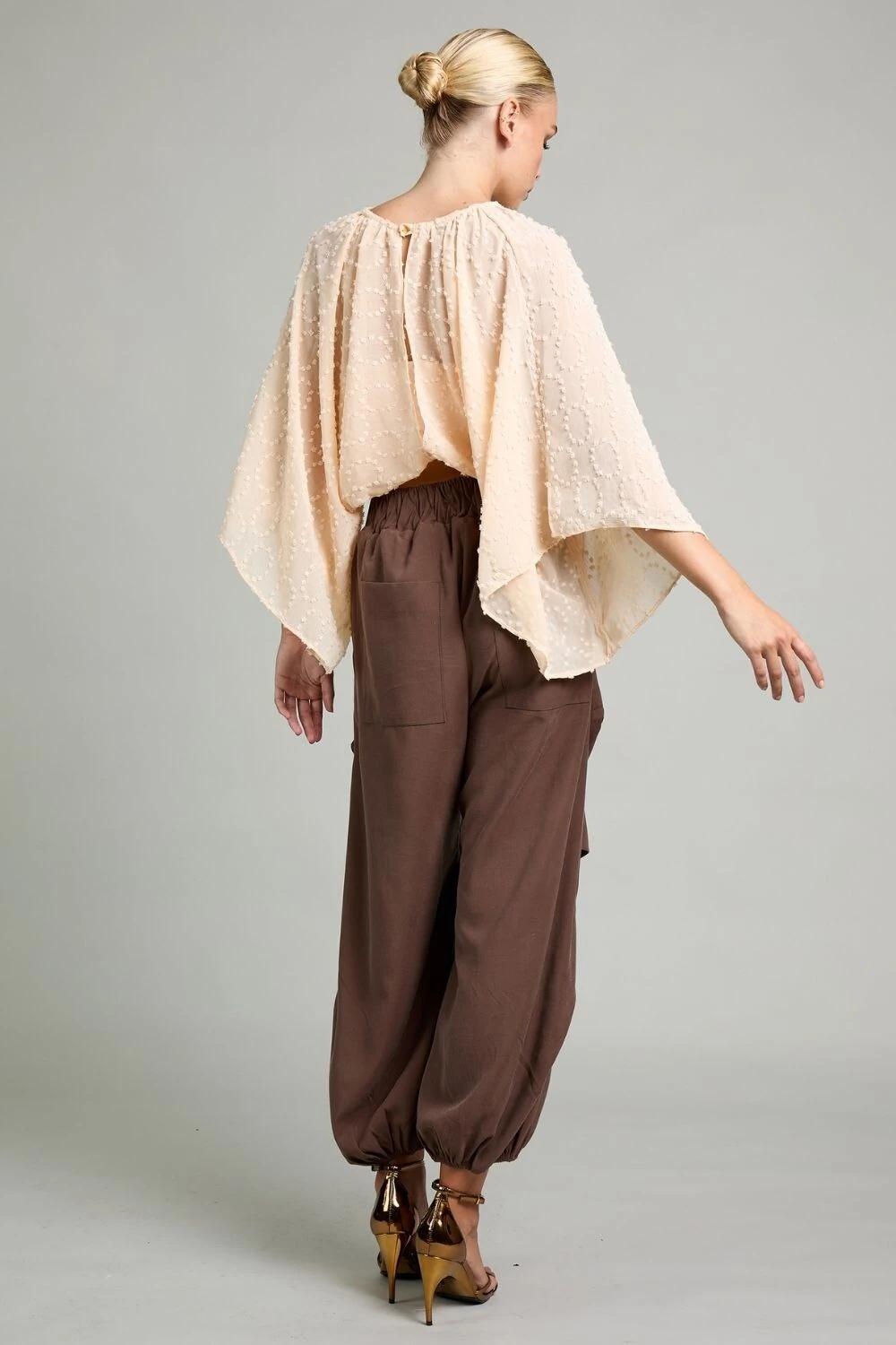 Uma blusa com mangas amplas, detalhe franzido, gola e elástico no cós é a combinação perfeita entre fluidez e estrutura. As mangas amplas trazem movimento e um toque sofisticado, equilibrando leveza e elegância. O detalhe franzido pode aparecer na gola ou ao longo da peça, adicionando textura e volume sutil. A gola pode variar entre um modelo alto ou mais fluido, complementando o design com um ar refinado. Já o elástico no cós ajusta a blusa ao corpo, criando um efeito blusê que valoriza a silhueta e traz versatilidade ao caimento. Perfeita para composições românticas ou contemporâneas, combinando bem com saias ajustadas ou calças de alfaiataria.