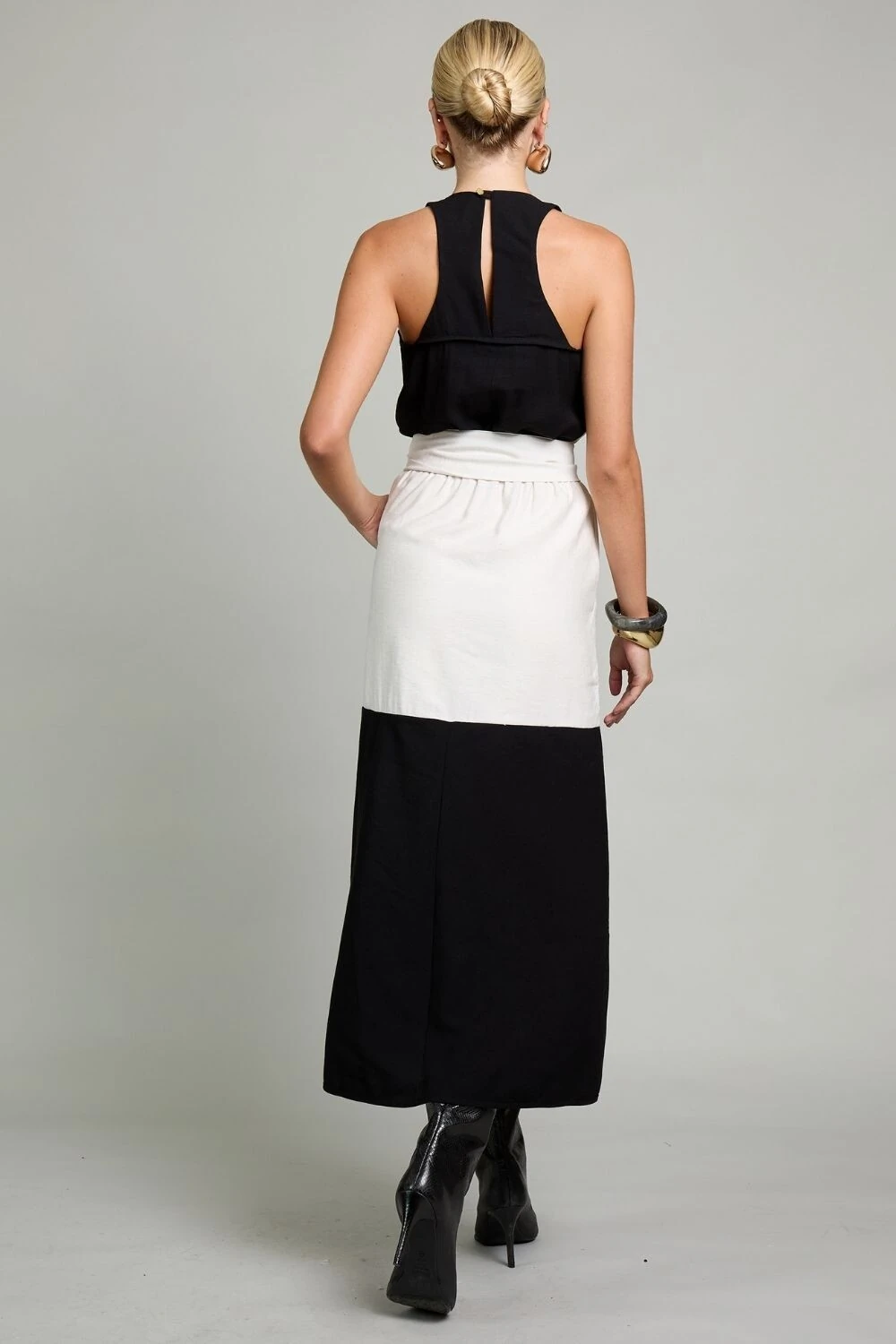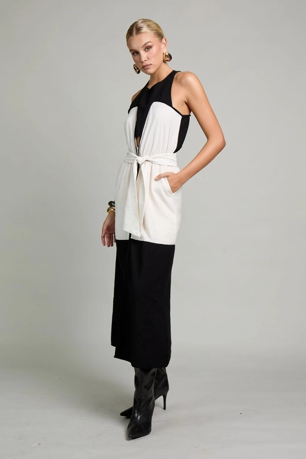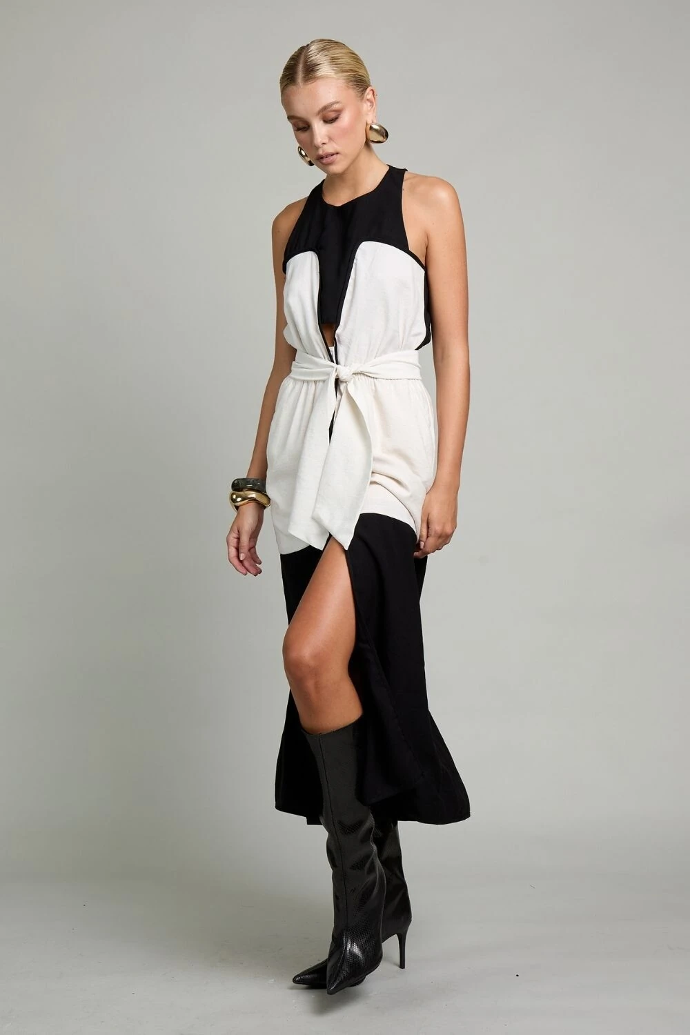 Vestido coliseu é a personificação da elegância moderna, desenhado para a mulher que busca sofisticação com um toque de ousadia. Confeccionado com tecidos premium que combinam o frescor do algodão e a leveza do poliéster, esta peça une o conforto à estética refinada, garantindo um caimento impecável e uma presença marcante. O contraste entre o branco e o preto profundo é harmoniosamente trabalhado em recortes geométricos, criando uma ilusão de movimento e destaque para a silhueta. O decote em V, com linhas retas e quadradas, adiciona um toque de modernidade, enquanto a fenda estrategicamente posicionada na parte inferior do vestido oferece uma sensualidade discreta e elegante, permitindo que a peça se mova com graça a cada passo.