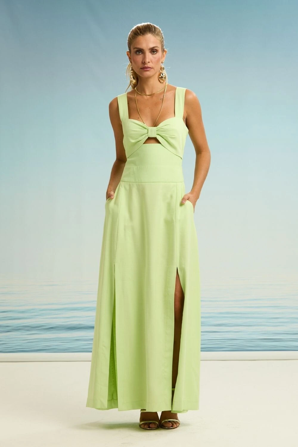 O vestido Mari é a união perfeita entre sensualidade e sofisticação, com um design que valoriza a silhueta e traz leveza ao look. Seu busto estruturado conta com um decote vazado, que adiciona um toque moderno e ousado, equilibrado pelas alças largas, que garantem sustentação e conforto. A pala ajustada na cintura define a silhueta, criando uma modelagem elegante e fluida. As duas fendas frontais trazem movimento e um ar envolvente, conferindo um charme extra à peça. Ideal para ocasiões especiais, o vestido Mari combina perfeitamente com sandálias minimalistas e acessórios sofisticados, criando um visual poderoso e irresistível.