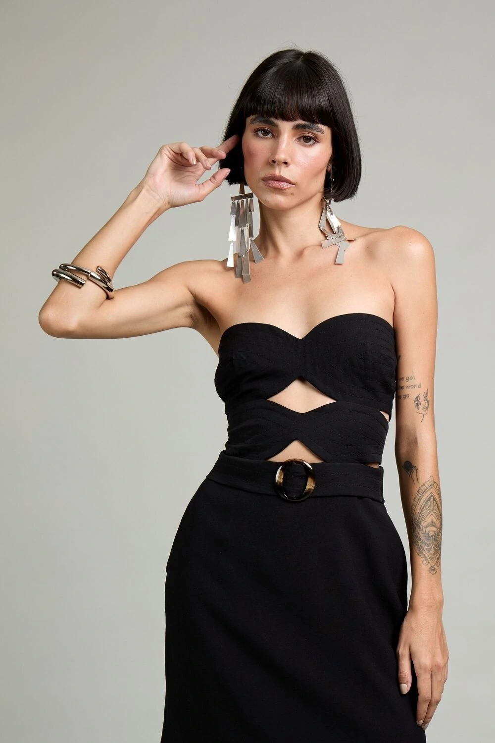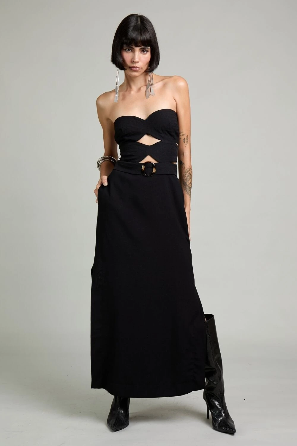 Um vestido com detalhe vazado frontal, cinto com fivela e bolso frontal é uma peça sofisticada e moderna, perfeita para composições versáteis. O vazado frontal adiciona um toque de sensualidade equilibrada, criando um ponto focal elegante no design. O cinto com fivela destaca a cintura, proporcionando um ajuste perfeito e valorizando a silhueta. Já o bolso frontal traz um elemento funcional e estiloso, adicionando um ar utilitário e contemporâneo à peça. Dependendo do tecido e do corte, esse vestido pode transitar entre looks casuais e sofisticados, combinando bem com sandálias minimalistas ou botas para um toque mais fashionista.