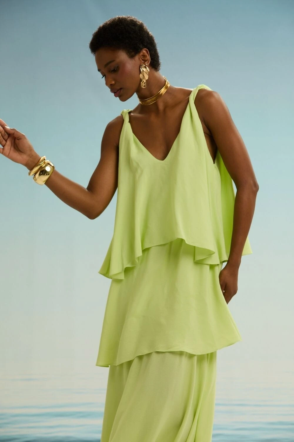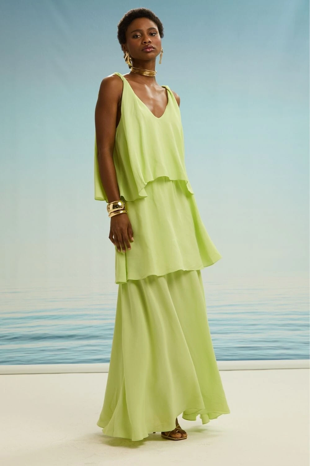Vestido Camadas longo, com recortes em camadas e decote em V, une frescor, elegância e movimento leve para um visual delicado.