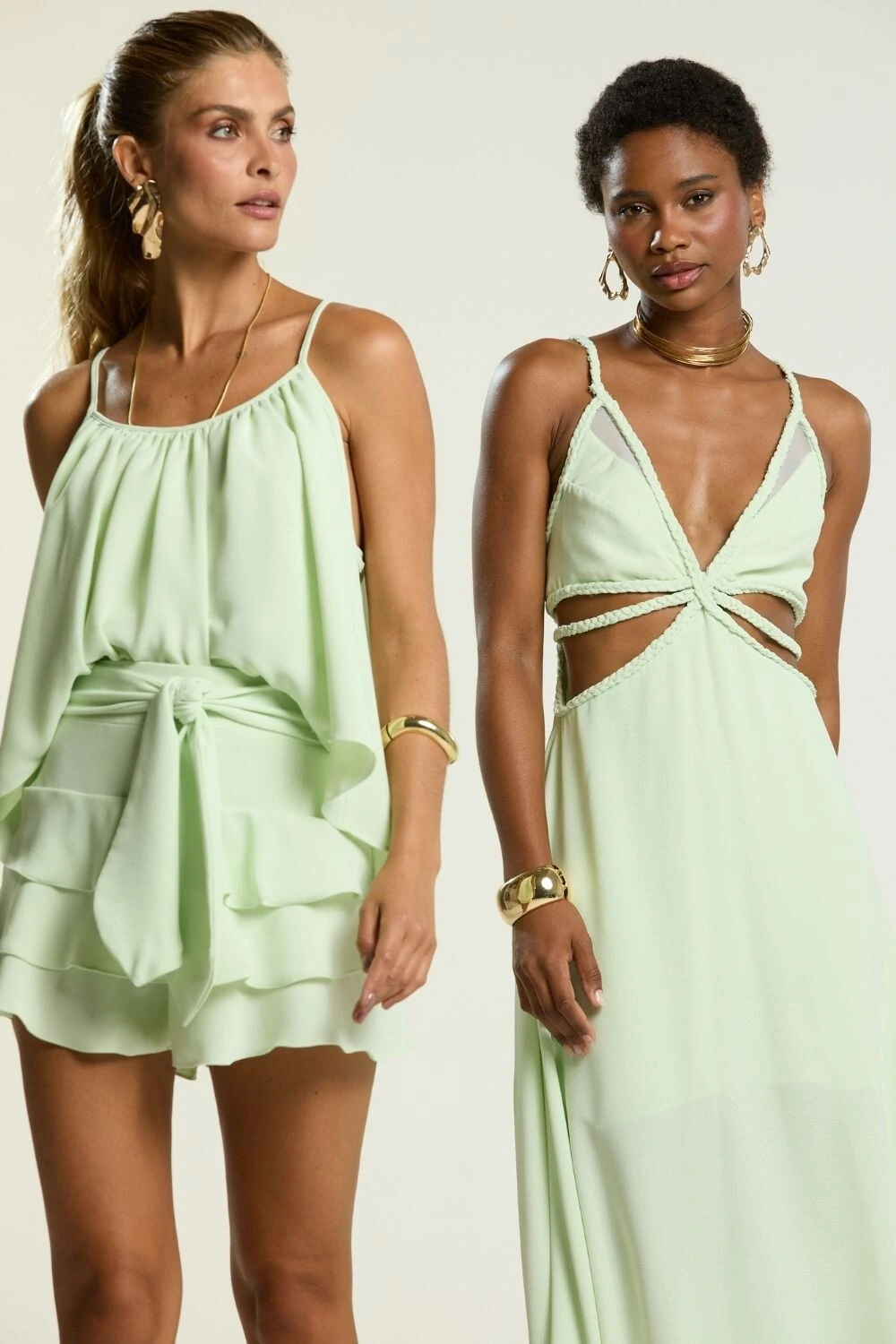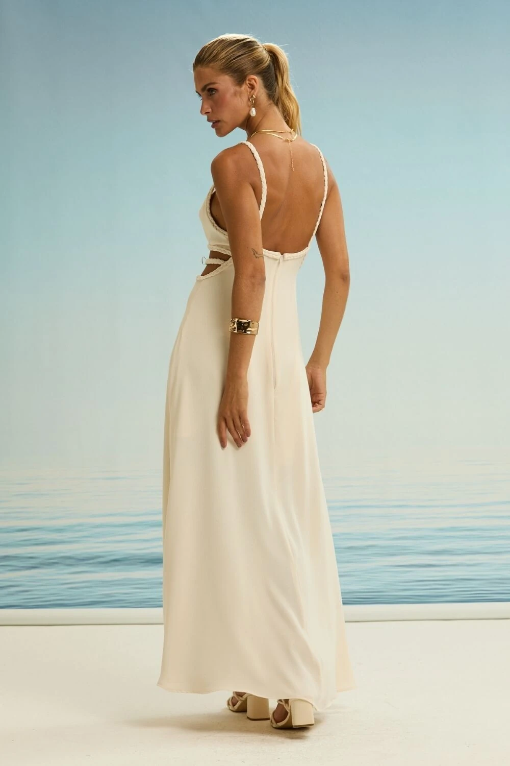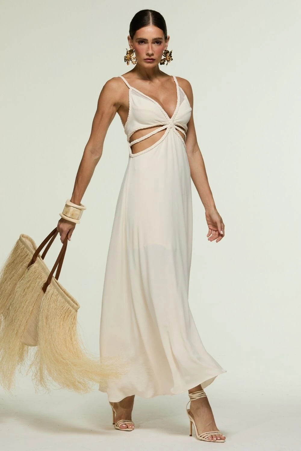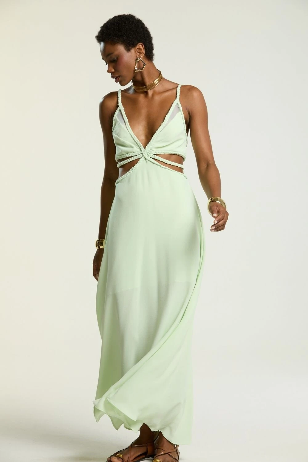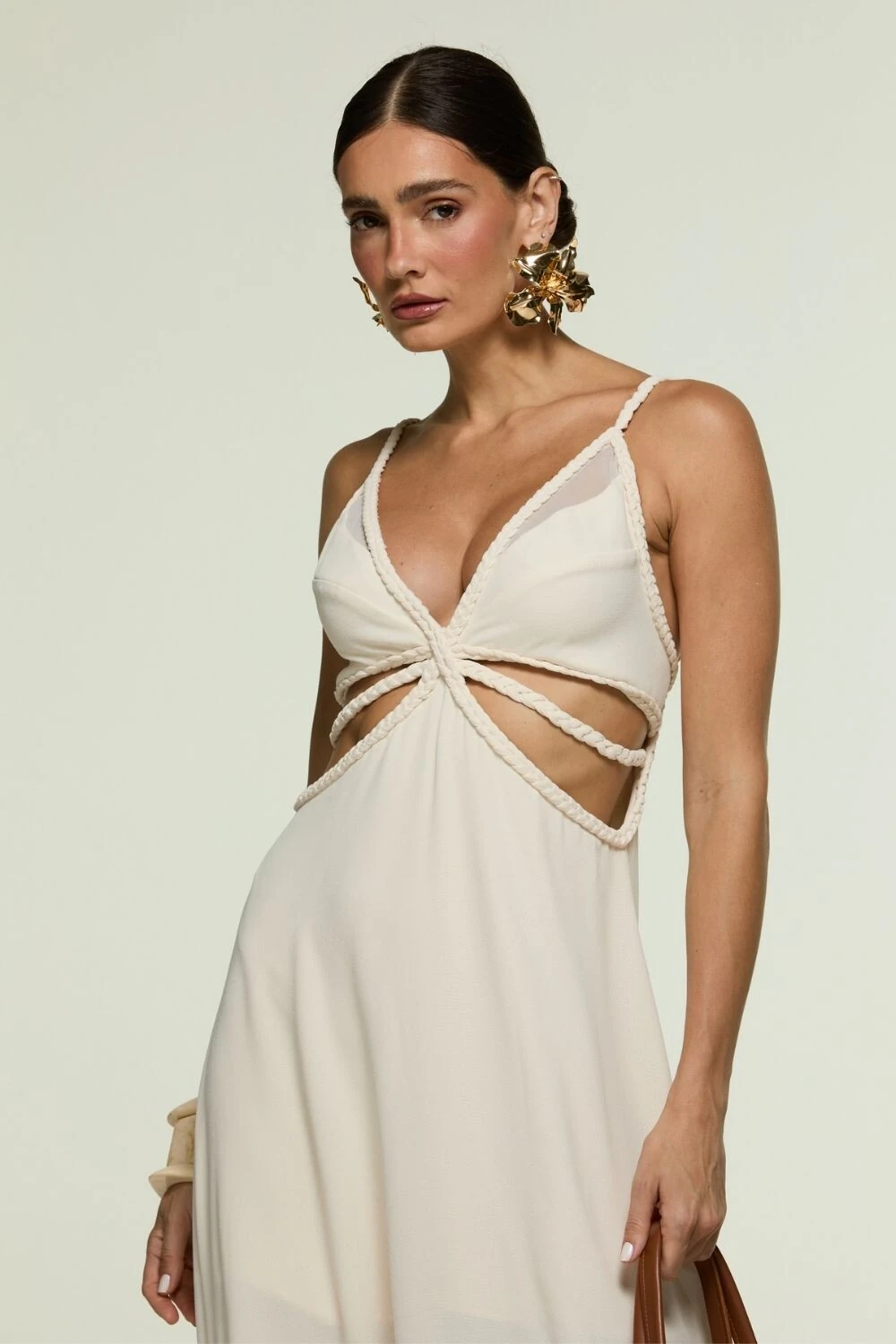 O Vestido Lateral Tranças é puro charme e sofisticação. Confeccionado em tecido leve, possui decote em V profundo, recortes laterais com detalhe em tranças e caimento fluido que valoriza a silhueta com elegância.