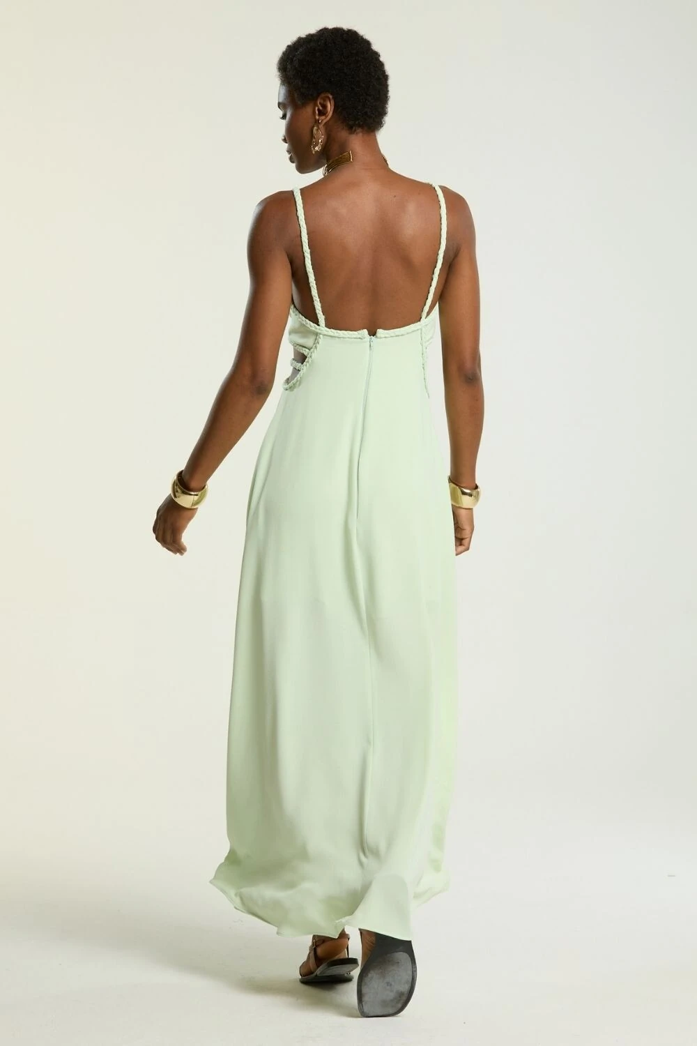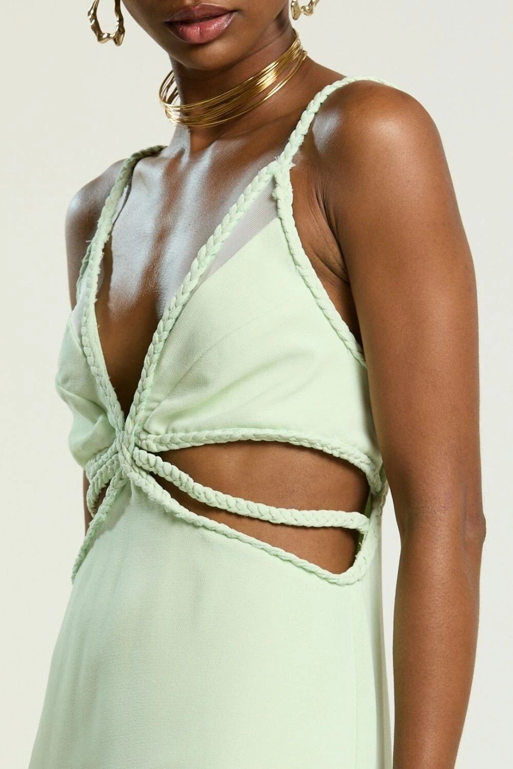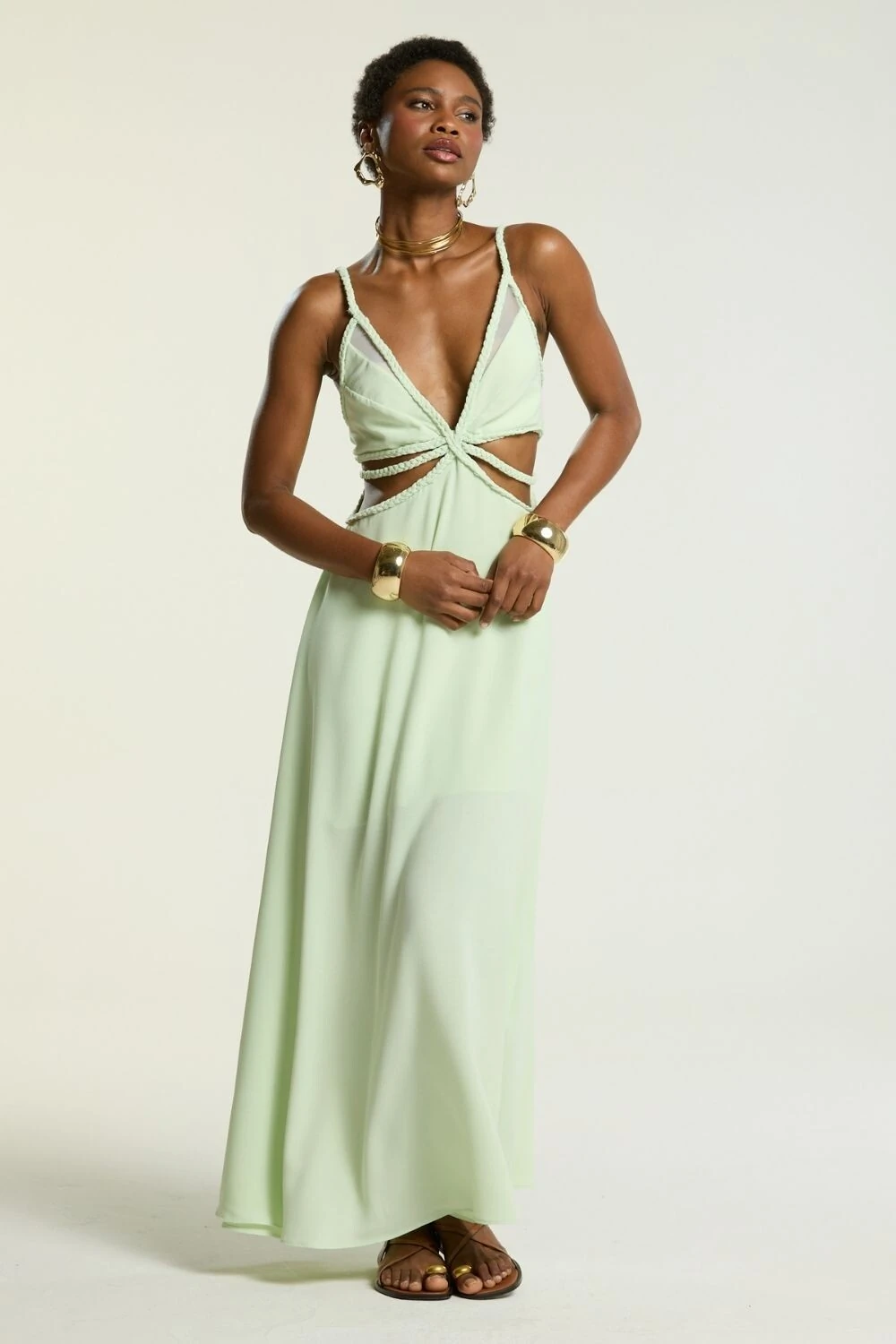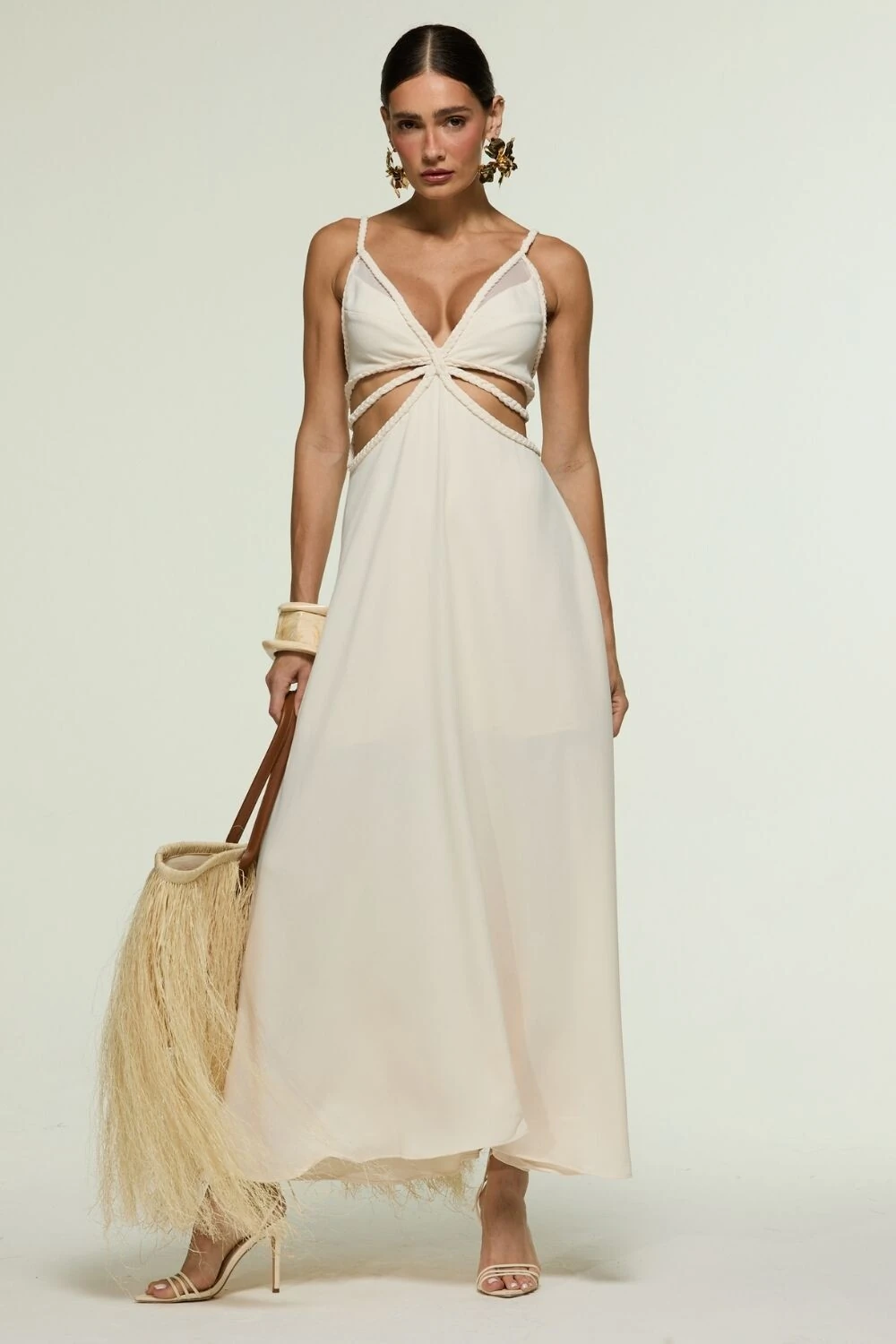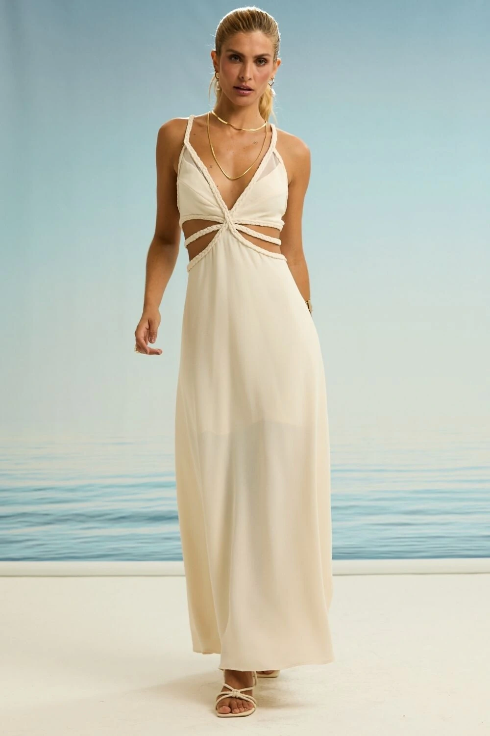 O Vestido Lateral Tranças é puro charme e sofisticação. Confeccionado em tecido leve, possui decote em V profundo, recortes laterais com detalhe em tranças e caimento fluido que valoriza a silhueta com elegância.