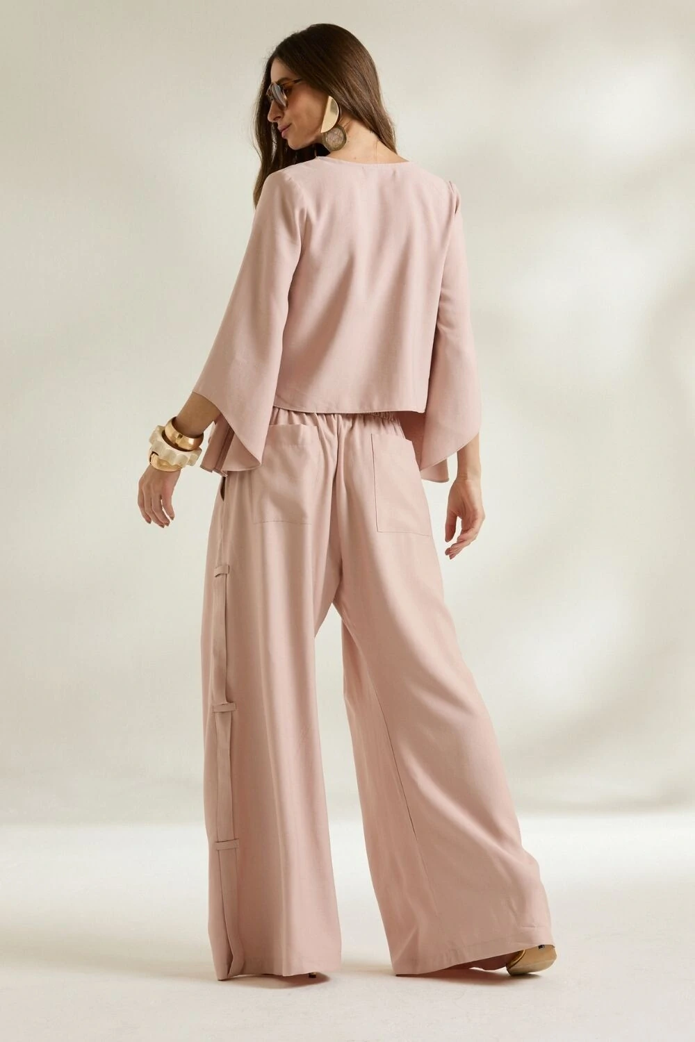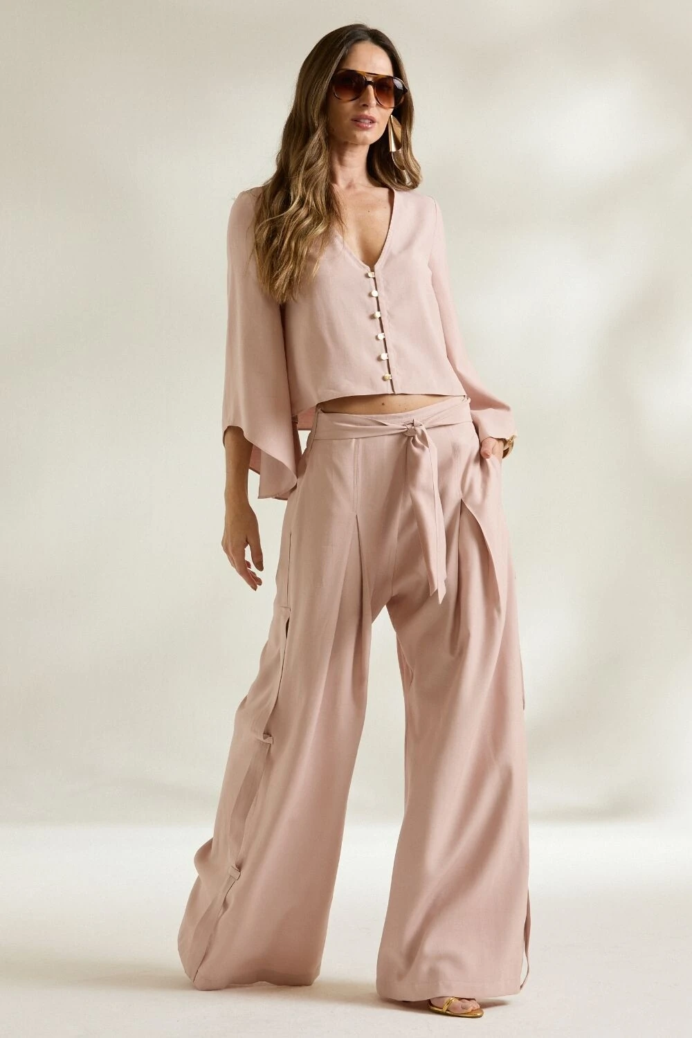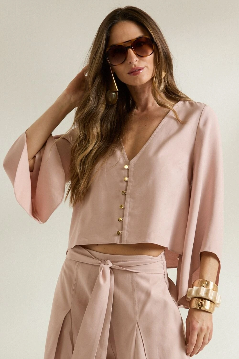 A Blusa Manga Godê é pura elegância e movimento. Com modelagem fluida e mangas amplas que criam um caimento leve e sofisticado, a peça traz um toque moderno com abotoamento frontal delicado e decote em “V”.