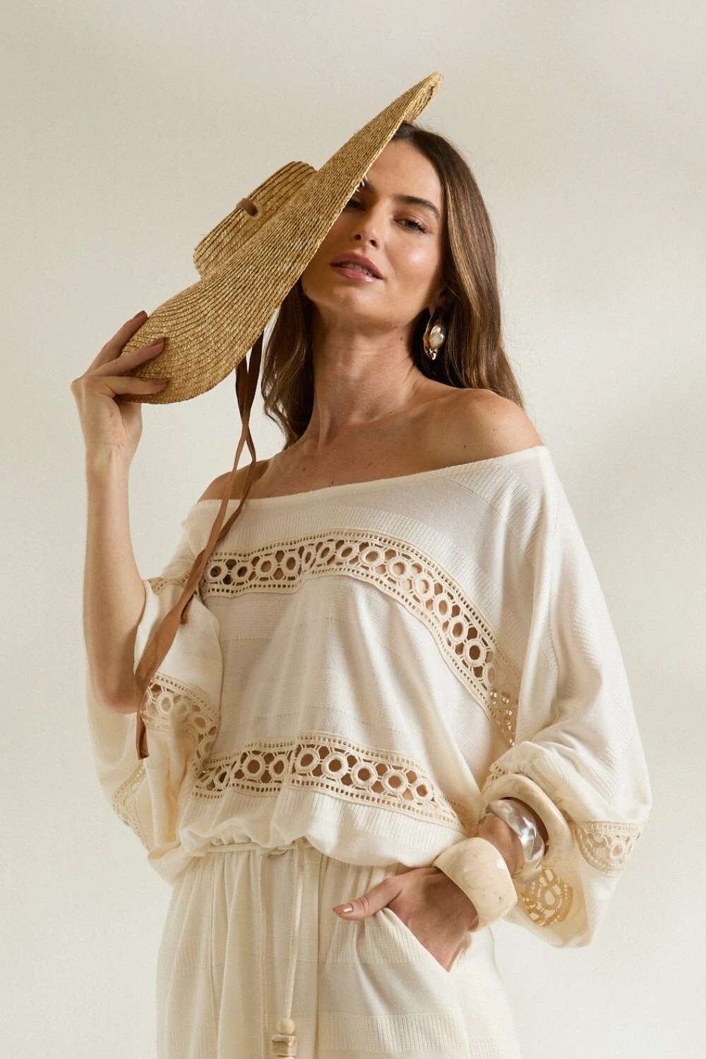 O Vestido Tricot Jacquard é puro charme e leveza. Confeccionado em tricot com textura delicada e detalhes em renda guipir, apresenta modelagem fluida, decote ombro a ombro e amarração na cintura, realçando a feminilidade com elegância.