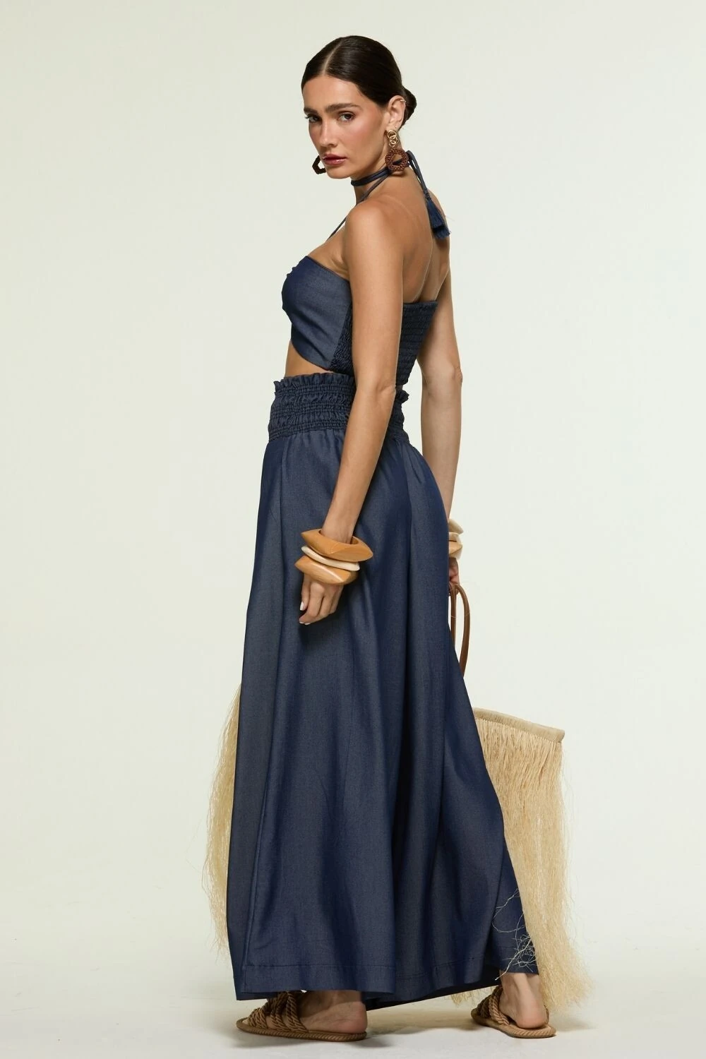 Top em denim rayon com modelagem tomara que caia drapeada, recorte central franzido e argola frontal. Possui amarração no pescoço e acabamento que garante sustentação leve e caimento macio.