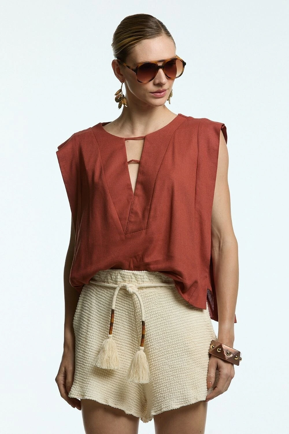 O Shorts Kansas é confeccionado em malha texturizada, oferecendo conforto e sofisticação. O modelo possui cintura alta com cós elástico, amarração em cordão com ponteiras artesanais e barra levemente ondulada.