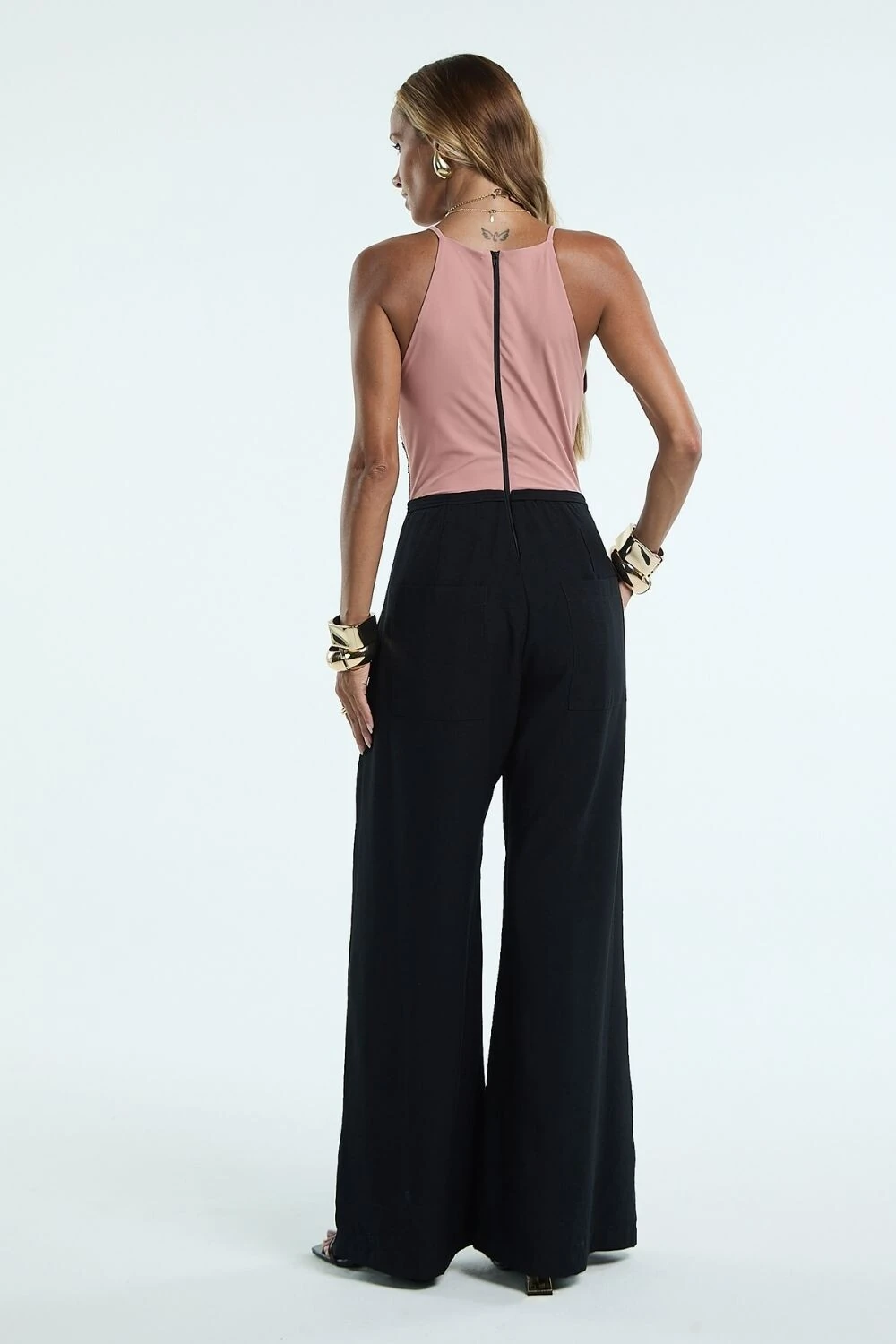 Macacão longo de proposta elegante, com parte superior em renda delicada que cria contraste sofisticado com a fluidez da calça ampla. O decote profundo valoriza o colo com leveza, enquanto o shape solto garante movimento e conforto ao vestir.